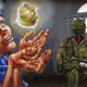 Two murals titled The Rapture in Madrid, in which a stocky minotaur kidnaps a horse, first takes it under his arm and then carries it on his back. The two scenes are figurative, in sepia tones. JAZ, the street artist, has long been inspired by his native Latin American culture and its chaotic history, as it relates to his own personal life. His dynamic and colorful images of muscular figures, hybrid animals and mythological beings are often used as stand-ins for the different and overlapping societies that he has observed throughout his career, and as a Mexican-Argentinean artist. Franco Fasol, alias JAZ, is an Argentina street artist born in Buenos Aires in 1981. He studied ceramic art and theatre scenography but since 2008 he has been actively involved in creating inspirational murals. His art is mainly large walls with a theme of either wrestling or some sort of conflict. Recently he has switched into animals and he usually uses a patern of repetition or a mirroring technique. He has attended numerous festivals around the world and his work is considered highly influential in the global street art community. Plaza de Puerto Rubio, Puente de Vallecas Madrid 2019